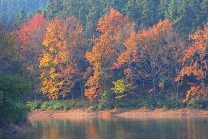 10:30 左右,我们到达甘岭水库,拍拍照,环境不错。然后我们沿着乡村小道,走到甘岭湖大坝上,豁然开朗,一湖秋色,波光粼粼,就在眼前。湖边红叶倒影,远处娘娘山矗立!
